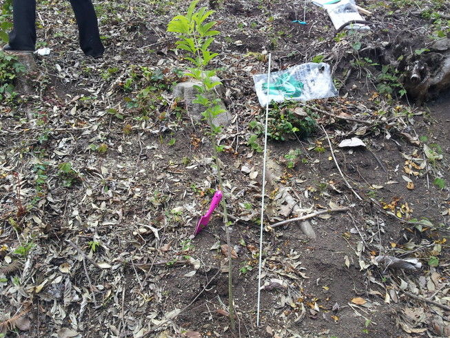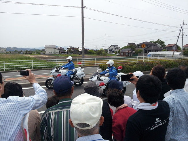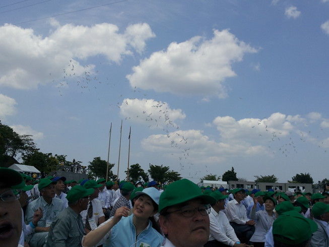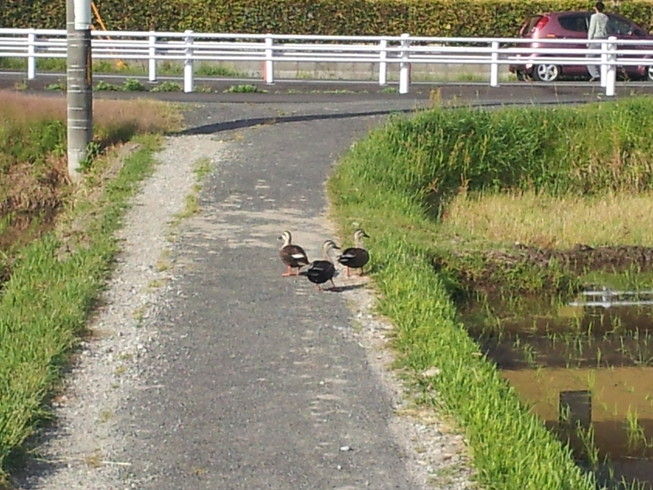 田植えが終わったこの頃、事務所の隣の田んぼで見かけた出勤・通学前の朝の一こま。