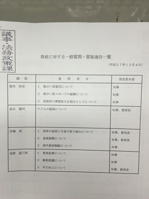 今日の質問戦は、午前中が自民党の福田、島谷議員、昼休憩を挟んで午後からは、民主党の伊藤、坂野議員の4人だった。