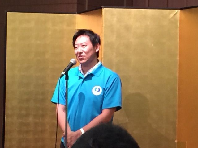 シンポジウムの終了後、ホテルに場所を移して記念レセプションが開催され、冒頭、挨拶に立つ鈴木長官。大山の急な勾配に疲労困憊したと漏らしていた。