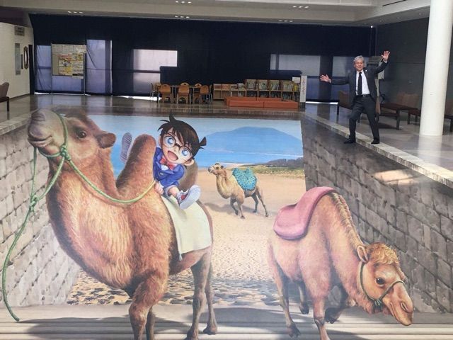 国際会館のロビー床に描かれた、「名探偵コナン」のトリックアート。