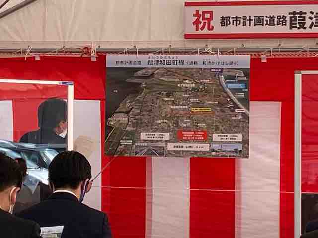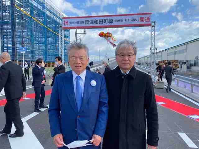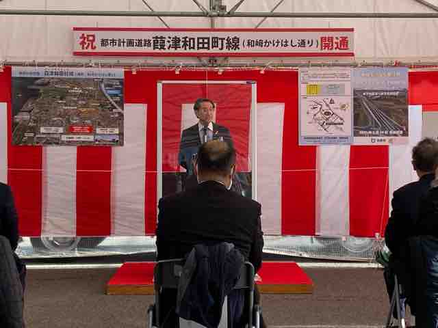 16日、都市計画道路「葭津和田町線」の開通式典が開催され、主催者の平井知事は、「JRに架かる跨線橋だが、ここは越せる橋」との駄洒落で挨拶を述べた。