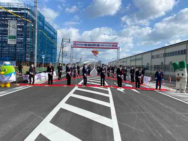 開通を待ちわびた地元和田浜工業団地協同組合の金田理事長にお祝いを述べ、大型バイオマス発電所の誘致を契機に更なる発展を祈念しながら、参加者で渡り初めをして供用開始を祝った。