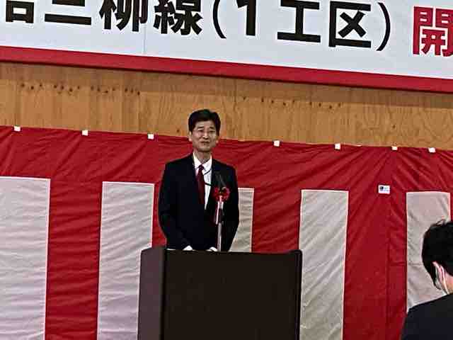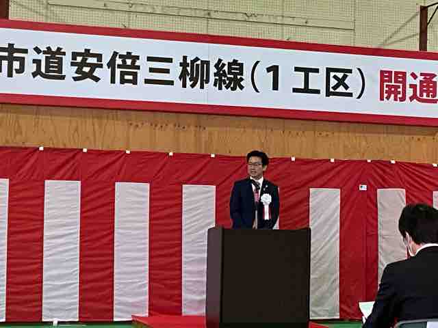 27日、「市道安倍三柳線1工区」の開通式が開催され、伊木市長は関係者への感謝と共に、「長年JR線路を越せないと言われてきたが、やっと越せる橋が完成した」と開通を喜んだ。