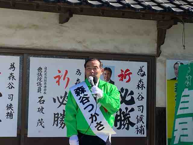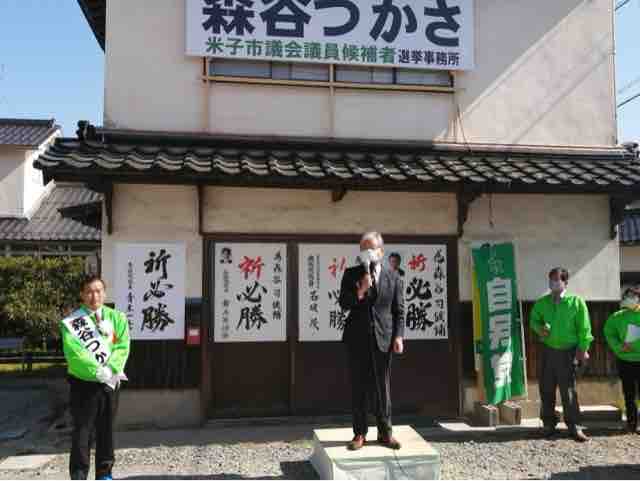 市議会議員の補欠選挙も同日告示され、森谷司候補の出陣式に参加した。