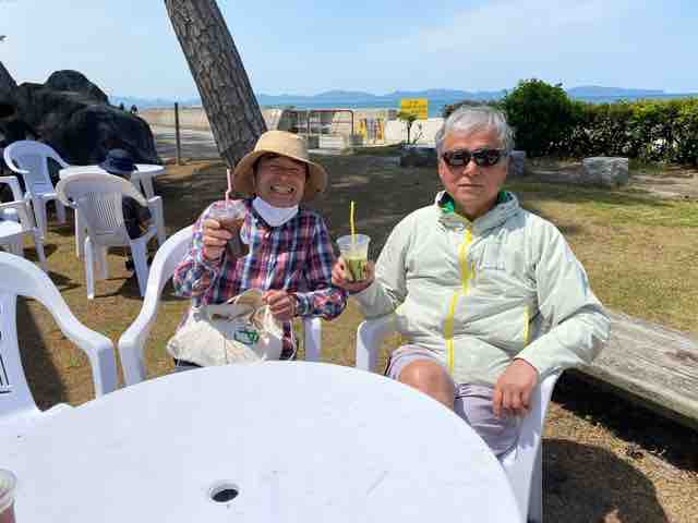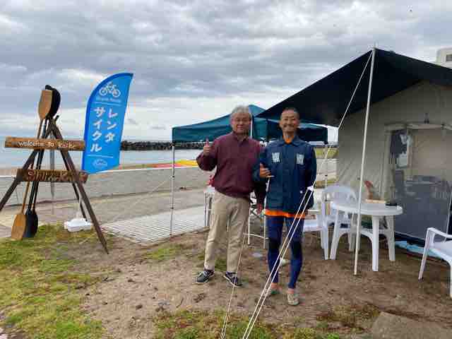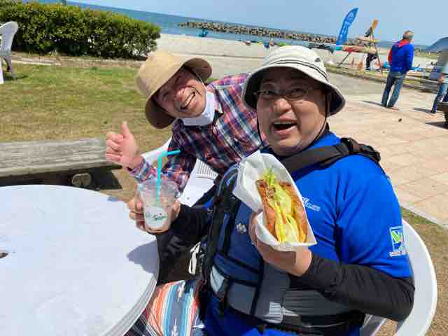 昼になると、サイクリング途中の伊達境港市長がイベント会場を訪れ、ビーチハウス・キラのビーフサンドに食らいつく岩﨑理事長を驚かせた。