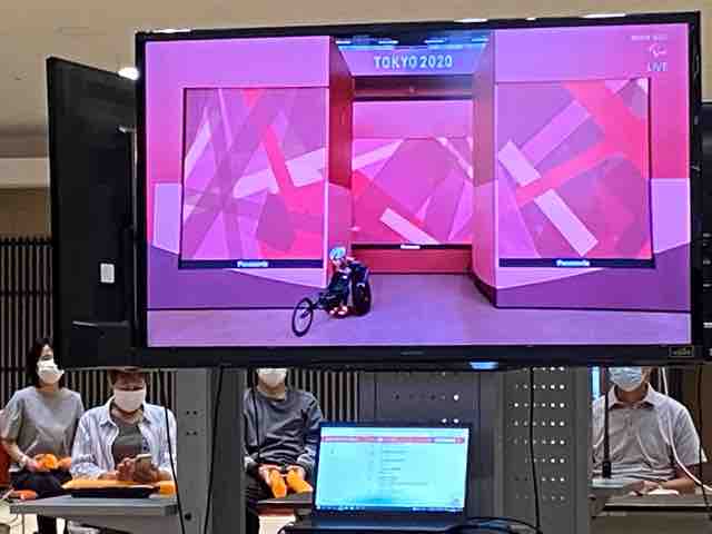 30日、鳥取県米子市出身の安野裕平選手が、東京パラリンピック陸上男子100ḿ(T33クラス)の決勝に出場し、米子コンベンションセンターに設営されたパブリックビューイング会場で応援した。